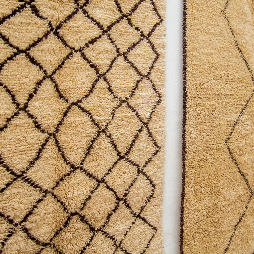 Les tapis Beni Ouarain se caractérisent par des motifs géométriques minimalistes en noir ou marron sur un fond ivoire, préservant leur originalité tribale. Contrairement à d’autres tapis berbères, ils n’ont pas été influencés par les motifs orientaux ou arabes.